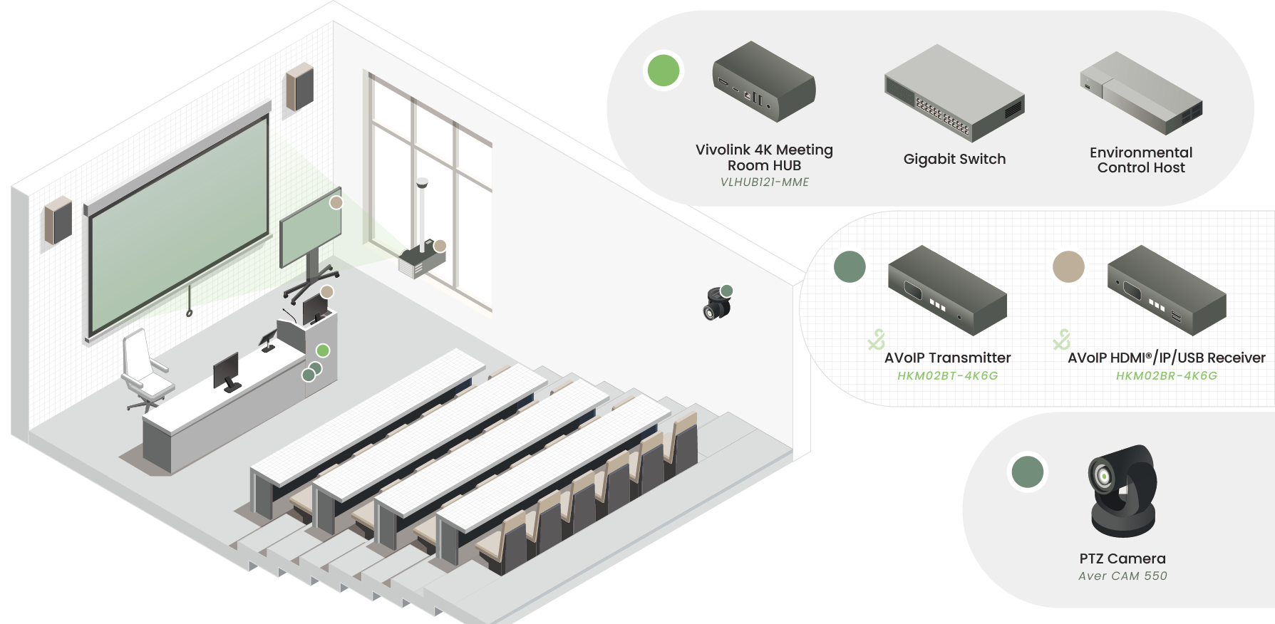 Built around a switch-centric AVoIP architecture, the system centralizes core equipment at the lectern while extending video, USB, audio, and control to distributed room endpoints.