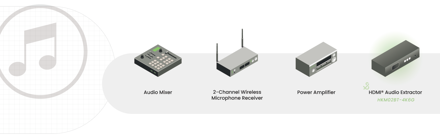 Wireless microphone audio is mixed, converted into digital USB audio, and then integrated into the Vivolink Meeting Room Hub for use by the instructor’s laptop.