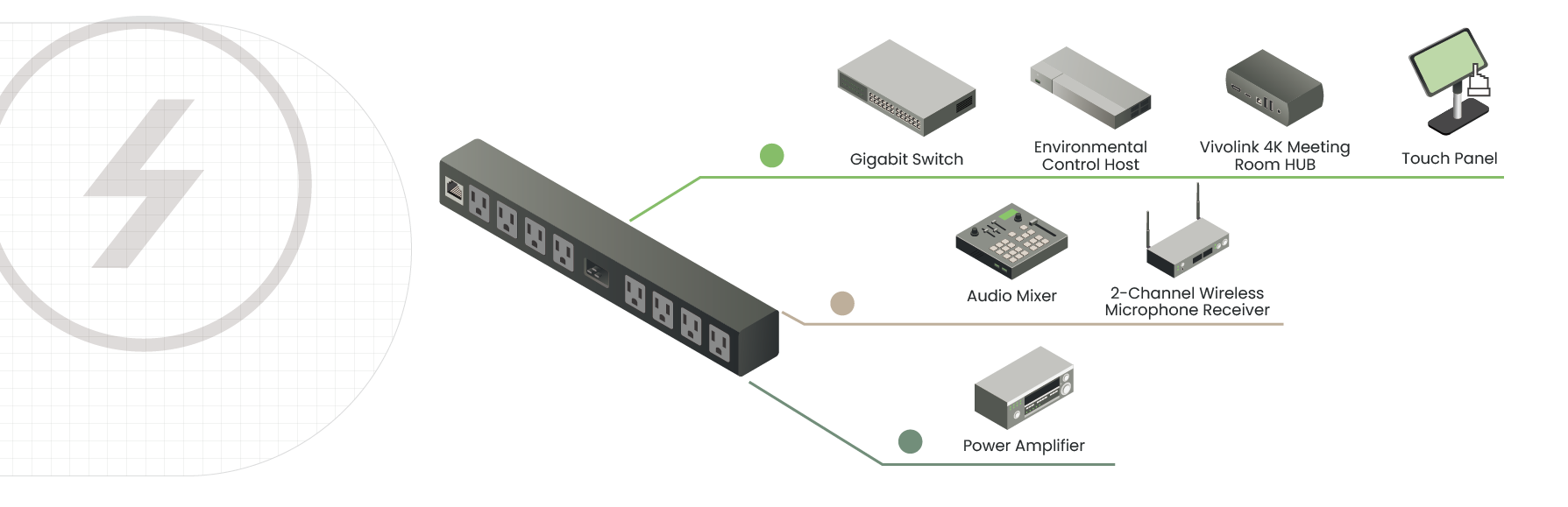 Port 1: Supplies power to the switch, control PC, Vivolink Meeting Room Hub, touch panel, and splitter.
