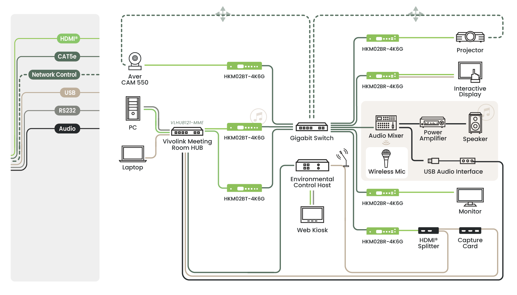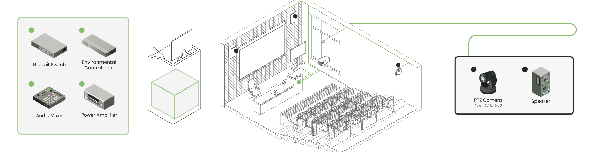 Core system hardware, including the network switch, audio mixer, amplifier, and control PC, is centralized in a lectern-side rack for easier management and maintenance. Remote endpoints such as cameras, displays, and audio devices are then connected over the AVoIP network, which allows HDMI, USB, and audio signals to be extended over structured cabling with lower cabling complexity than traditional point-to-point runs.