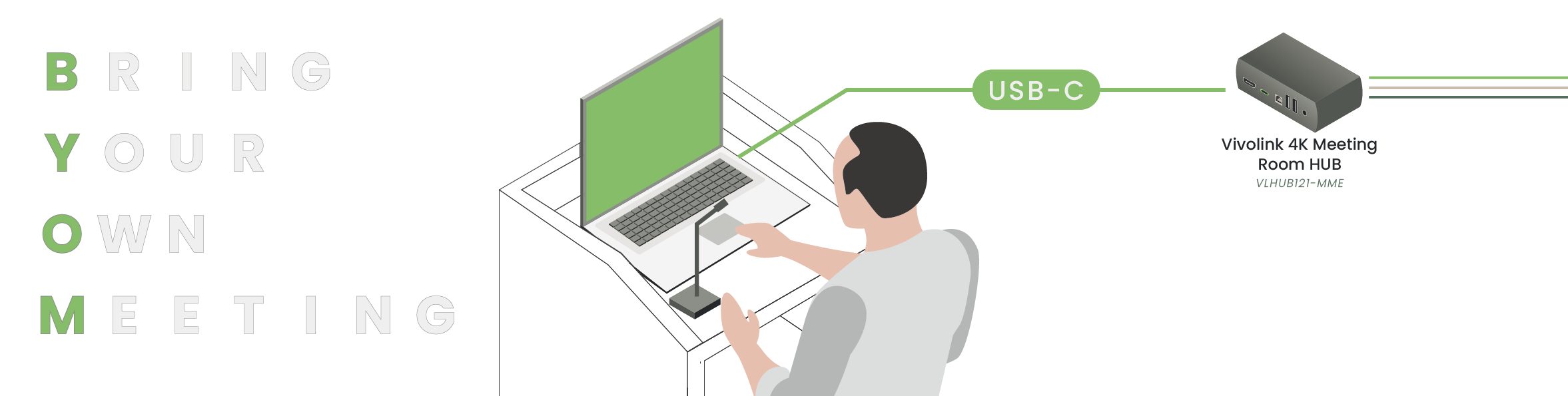 For remote learning sessions, the instructor connects a laptop through the Vivolink Hub to activate a BYOM workflow, gaining direct access to the room camera and audio system.