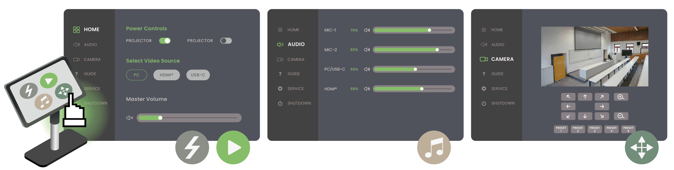 Core functions such as projector and camera power control are integrated into the same UI, streamlining room startup and operation.