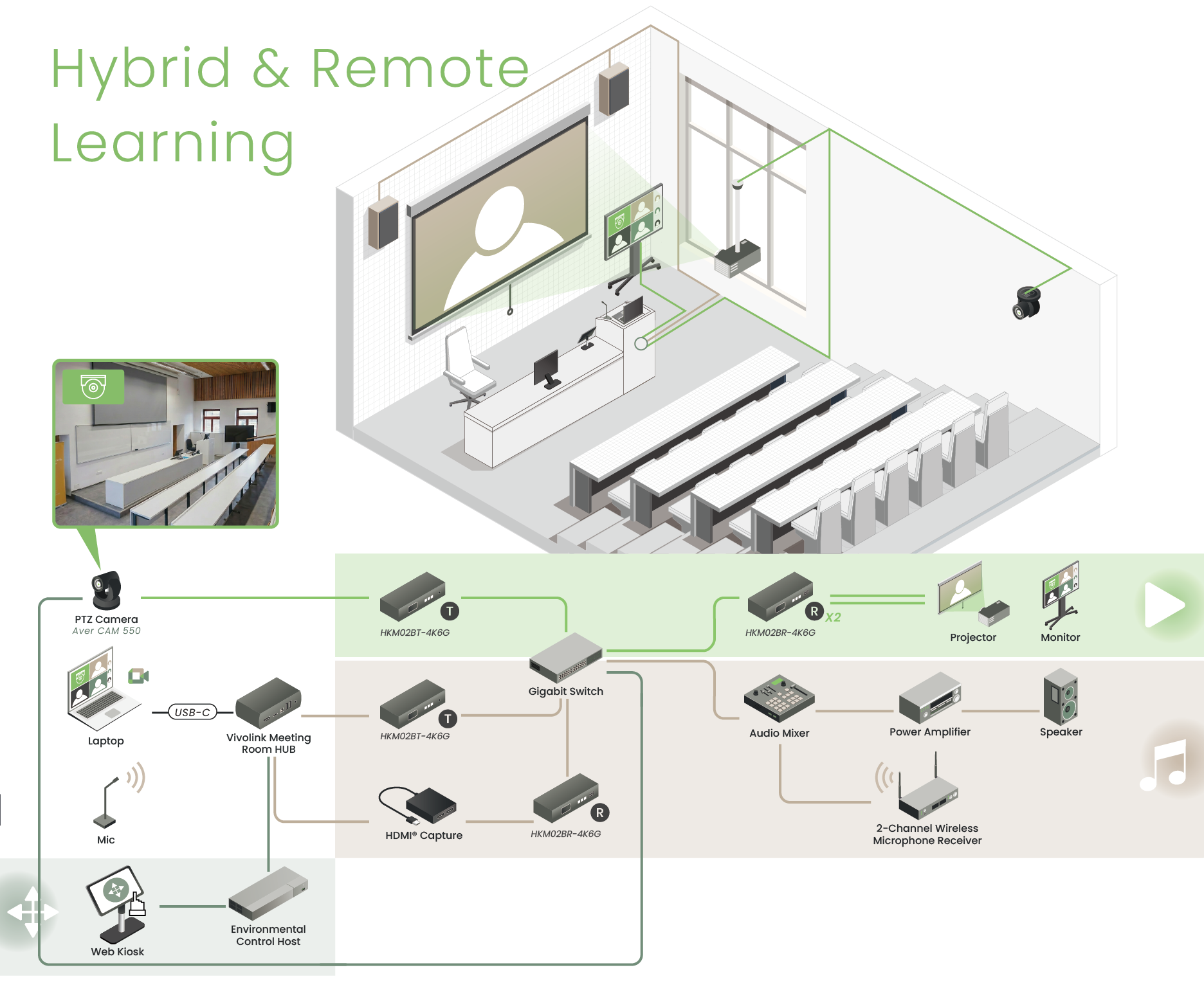 Through the HDMI/IP/USB transmission system, the instructor can bring the room camera and audio devices into their own conferencing software for BYOM use.