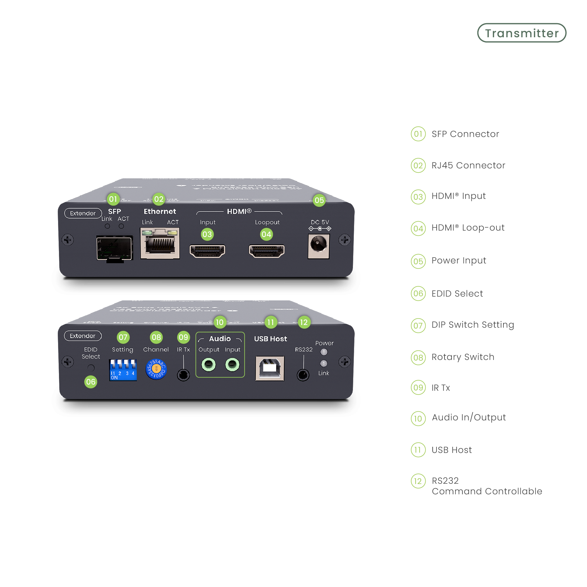 Supports IR, RS232 transmission, and EDID management.