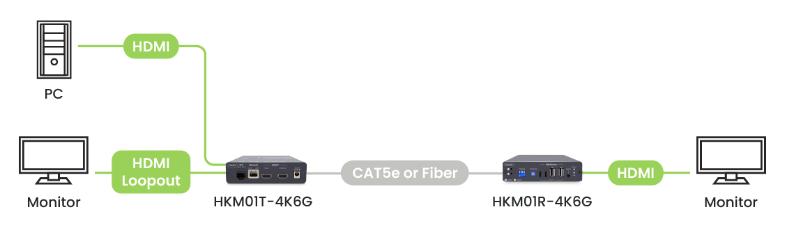 The HKM01-4K6G HDMI® KVM Extender is designed to support 4K60Hz resolution and USB KVM transmission. You can opt for KVM over Ethernet or KVM over fiber transmission and enjoy seamless extension. The USB KVM extender also supports bidirectional audio, RS232, and IR signals, streamlining device management, and featuring EDID management for easy display configuration.