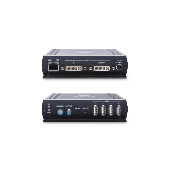 Long-distance DVI extension, optional USB KVM control, DVI↔HDMI conversion models available.