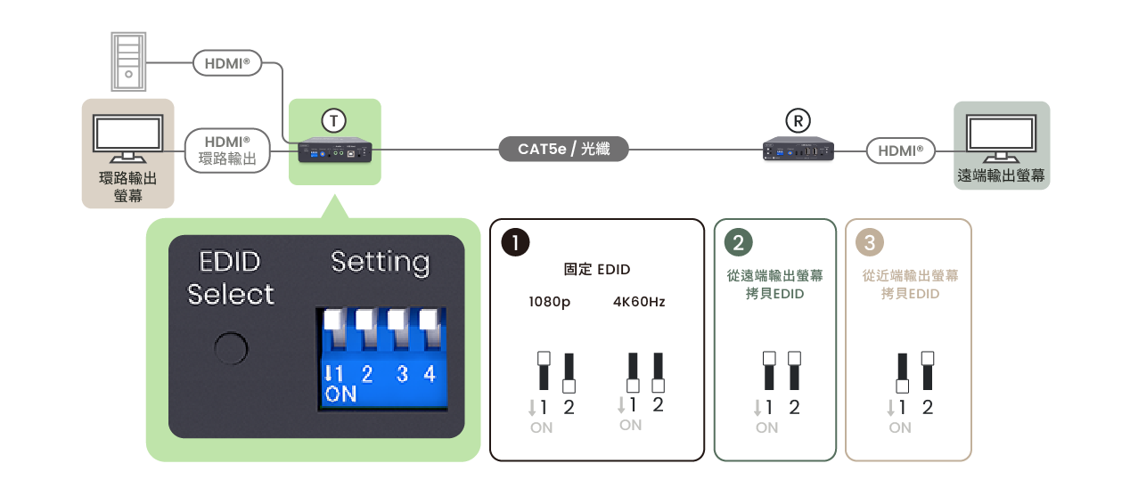 HKM01-4K6G 的傳輸端、接收端可串接網路交換器,將兩端設備的旋轉開關設定為相同的數字後,便可以達到多對多控制的功能。