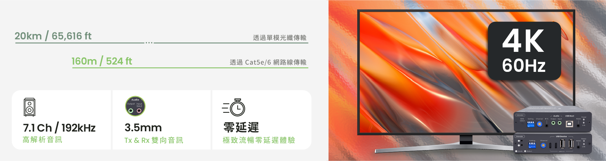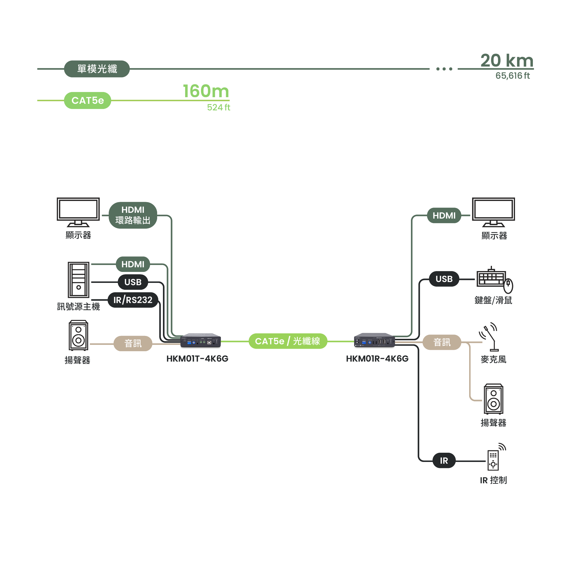 經 SC&T 內部實測,HKM01-4K6G 使用 CAT5e 線材可達 160 公尺。此外,若使用光纖模組傳輸,最遠傳輸距離可達 60 公里,滿足各式中長延伸距離的需求。