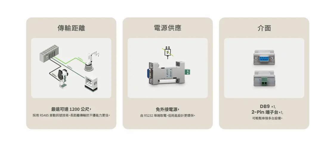 RS001 符合 EIA/TIA 串列通訊標準,確保相容於舊型與新型設備。